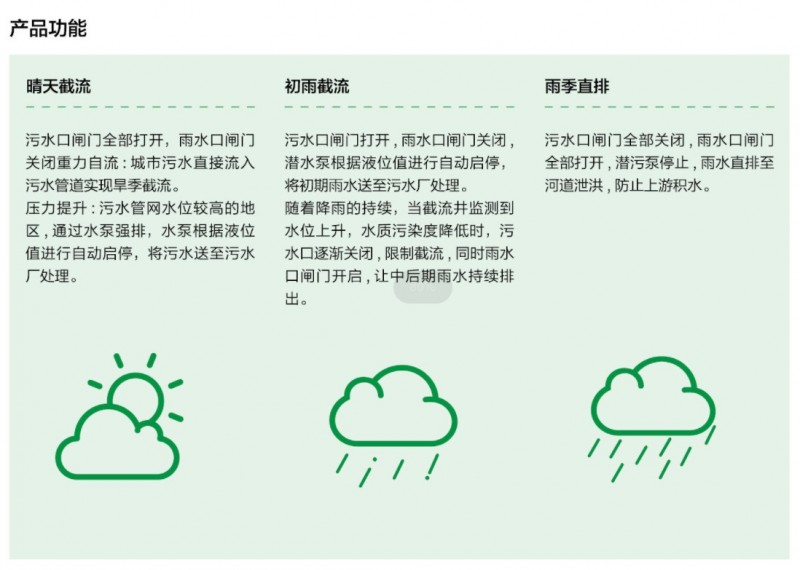 針對目前合流製管道汙水直排,分流製管道中存在混接汙水,初期雨水溢流汙染導致河道水體黑臭的問題,海辰開發了一體化智慧截流提升井。通過在線監控係統,將晴天汙水與初期雨水截流至汙水管網中,後期雨水分流至雨水管網或河道中,實現“晴天截流,初雨截流,雨季直排”的功能。一體化智慧截流提升井能夠完成截汙納管的工作,在解決城市黑臭水體問題方麵起到突出的作用。